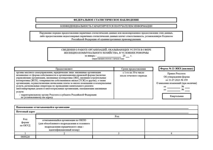 С отчета за январь-март 2024 года статотчетность нужно сдавать по форме 22-ЖКХ (жилище) «Сведения о работе организаций, оказывающих услуги в сфере жилищно-коммунального хозяйства, в условиях реформы», которую утвердили приказом Росстата от 31.07.2023 № 359.