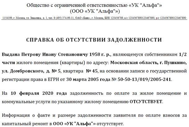 Закон не устанавливает форму справки об отсутствии задолженности за ЖКУ. Вы можете воспользоваться нашей формой (рисунок 2). В справке нужно указать даты формирования и выдачи справки и информацию о задолженности, если такая есть.