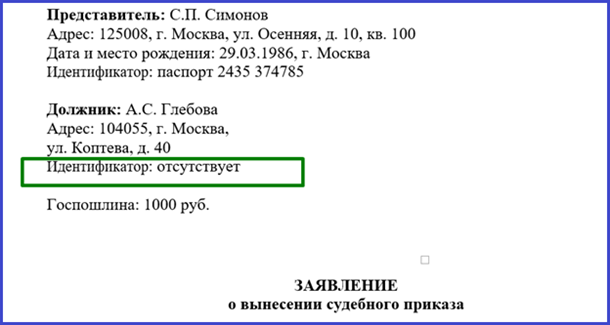 Рисунок 2. Пример указания в заявлении о вынесении судебного приказа отсутствия идентификаторов