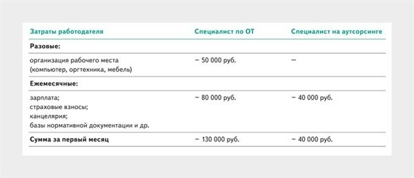 Сравнение затрат работодателя на специалиста по ОТ с затратами на аутсорсинг