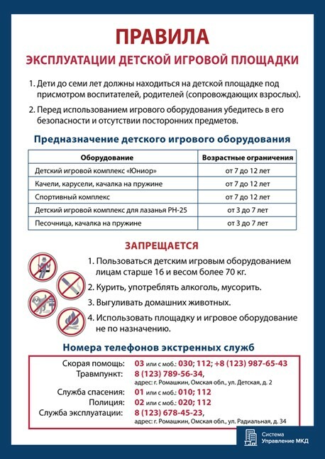 В числе прочей информации укажите контактные телефоны управляющей организации и адрес электронной почты, на который можно прислать фото поврежденного оборудования и опасных конструкций на детской площадке. Тогда вы будете оперативно получать информацию о проблемах и сможете отреагировать на нарушения прежде, чем надзорные органы укажут на них в протоколе.