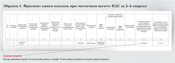 Как правильно. Когда частично заявляете НДС к вычету, в графе 14 книги покупок отражайте полную стоимость покупки, которая указана в графе 9 счета-фактуры. Сумму налога в графе 15 книги покупок показывайте только в той части, которую принимаете к вычету за отчетный квартал. Другие графы книги покупок заполняйте в общем порядке. При частичном вычете один и тот же счет-фактуру нужно регистрировать в книге покупок несколько раз в тех кварталах, в которых будете заявлять вычет (подп. «с» и «т» п. 6 Правил ведения книги покупок).