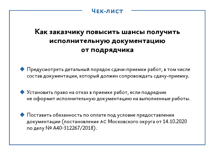 Снизить риски удастся, если в договоре подряда установить конкретный способ направления документов, а также срок для мотивированного отказа вместо часто используемой формулировки «разумный срок». Последнюю суды всегда трактуют индивидуально.