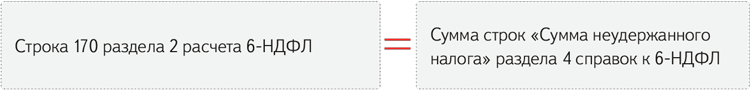 Общая сумма неудержанного НДФЛ. Строку 170 «Сумма налога, не удержанная налоговым агентом» раздела 2 расчета инспекторы сопоставят со строкой «Сумма неудержанного налога» раздела 4 справок о доходах к 6-НДФЛ: