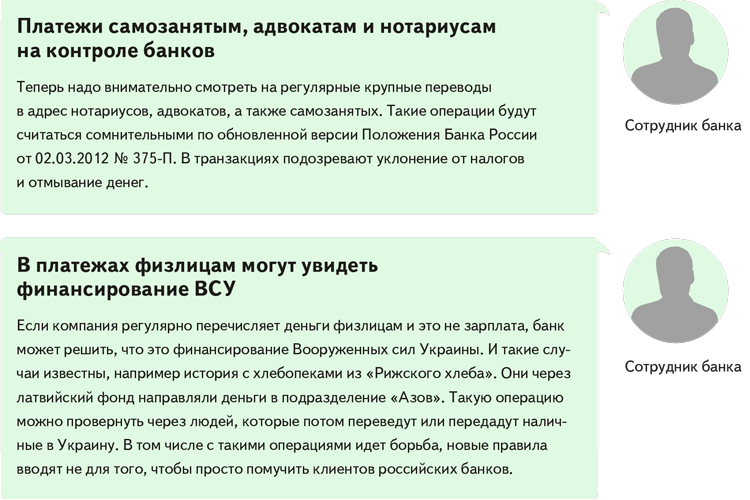 Платежи физлицам. Под повышенное внимание банков попадут крупные регулярные выплаты физлицам. Особенно оплата услуг нотариусов и адвокатов. Исключение — зарплата и кредиты. Контролерам давно уже не нравится, как бизнес работает с самозанятыми. Депутаты называют введение режима НПД ошибкой, и пошли разговоры об его отмене.