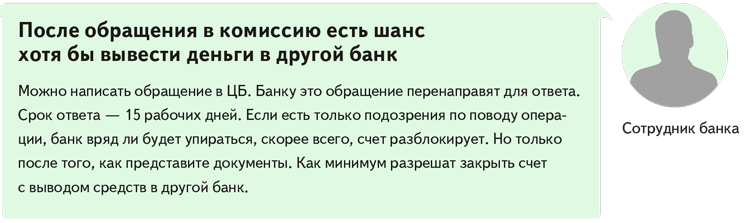 Нет гарантии, что после обращения в комиссию при ЦБ вы сможете провести спорную операцию в этом банке. Но наверняка вам позволят хотя бы вывести деньги в другой банк.