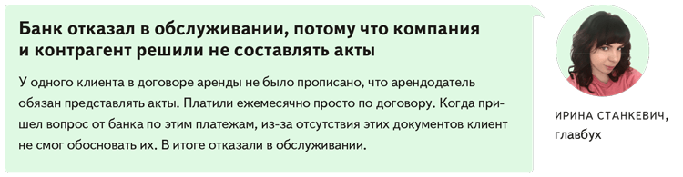 Проверьте список документов в договорах с контрагентами. Предусмотрите в договорах, что вы оформляете документы, которых будет достаточно для банка. Не пренебрегайте, например, актами. Главбух рассказала о ситуации, когда из-за их отсутствия банк отказался работать с компанией.