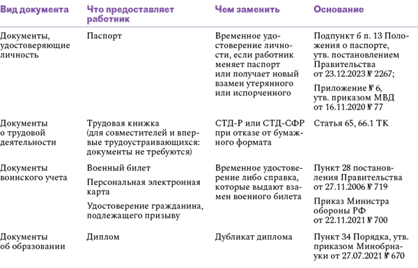 Когда можно проявить гибкость. Кадровик может оформить работника, если он принесет временное удостоверение личности (подп. «б» п. 13 Положения о паспорте, Приложение № 6, утв. приказом МВД от 16.11.2020 № 773). Документ служит официальной заменой паспорта, когда гражданин меняет паспорт или получает новый взамен утерянного или испорченного. В таблице ниже собрали информацию о том, какие документы новичок может представить взамен обязательных при трудоустройстве.