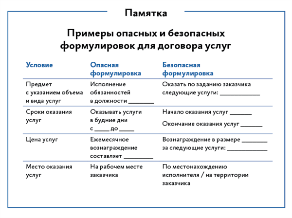 Если компания включит в договор услуг условие о графике работы, суды могут посчитать, что это отсылка к трудовым отношениям.ВС15-1 Ведь исполнитель сам определяет время для оказания услуг и не должен зависеть от режима работы компании или ее пожеланий. Поэтому рекомендуем фиксировать в договоре не график работы, а начальный и конечный сроки оказания услуг.ГК-1