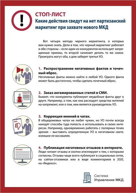 Мы не рекомендуем пользоваться методами «черного» партизанского маркетинга, так как в перспективе они могут принести вред для репутации вашей УО и вас лично.