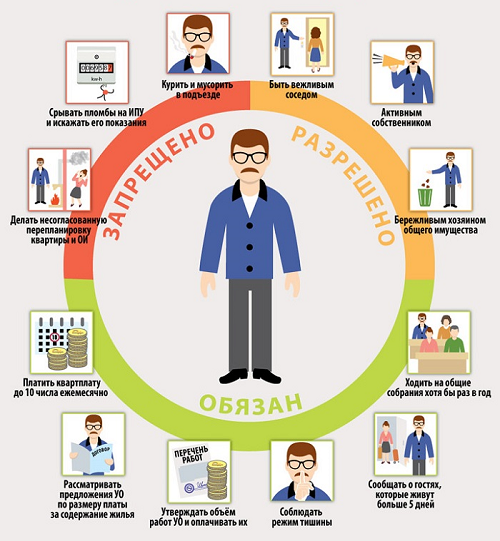 Как сосед он должен уважать права и интересы проживающих в доме собственников и пользователей помещений. Что может делать собственник, а что нет, мы наглядно показали на рисунке 1.
