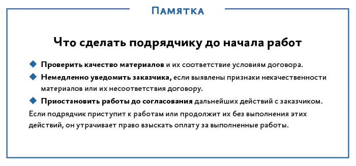 Проверить качество материалов подрядчик должен еще до начала работА73 и при выявлении их непригодности или недоброкачественности немедленно уведомить заказчика и приостановить работы.ГК-1 Если этого не сделать и продолжить работы, подрядчик не вправе впоследствии ссылаться на данные обстоятельства,ГК-2 если не докажет, что недостатки материалов не могли быть обнаружены при их приемке. Продолжение работ без замечаний к качеству материалов лишает подрядчика права впоследствии ссылаться на их ненадлежащее качество, в том числе при требовании оплаты.А57-1 Работы, выполняемые подрядчиком после направления требования об их приостановке, приемке и оплате не подлежат.А28