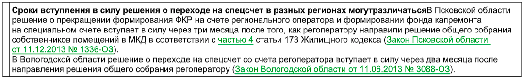 Вы направляете протокол общего собрания о переходе на спецсчет регоператору, а через год решение вступает в силу. Субъект РФ может установить меньший срок вступления в силу решения о смене способа формирования ФКР на спецсчет (ч. 5 ст. 173 Жилищного кодекса).