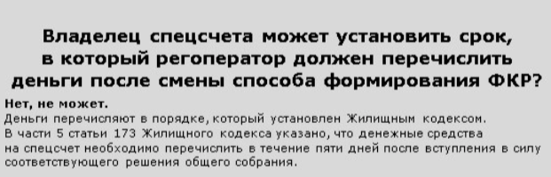Спустя год после того, как регоператор получил протокол о смене способа формирования ФКР в пользу спецсчета, он должен перечислить накопленные собственниками помещений в МКД деньги на специальный счет.