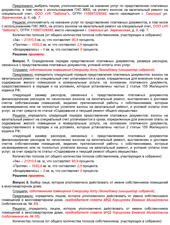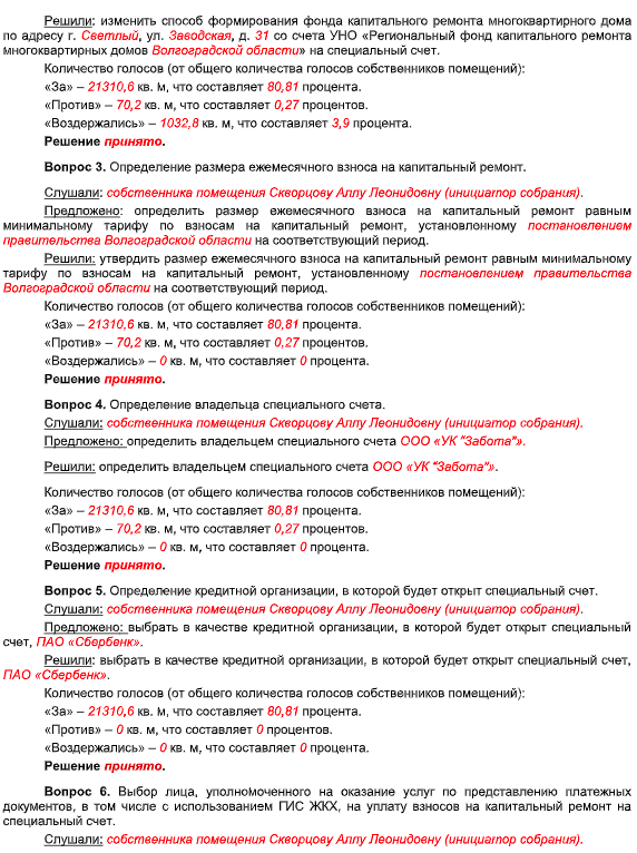 Решение общего собрания об изменении способа формирования ФКР оформляют протоколом. Он будет официальным документом (ч. 1 ст. 46 Жилищного кодекса). В протоколе нужно описать все результаты голосования по каждому вопросу повестки.