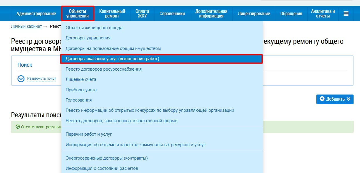 Сканированный договор после загрузки в систему нужно привязать к конкретным МКД в управлении Требования к договорам на СиТР, которые УО и ТСЖ вносят в систему, общие: отсканировать документы нужно полностью и ровно, без загибов. Все слова должны читаться. Если есть приложения, то их также сканируем. Размещается файл во вкладке «Договоры оказания услуг и выполнения работ». Чтобы к ней перейти, в главном меню нажмите «Объекты управления»: