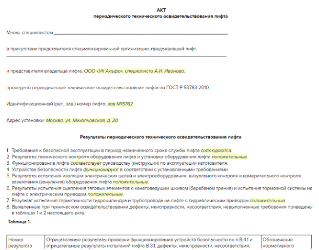 На рисунке 3 мы показали пример оформленного акта периодического освидетельствования лифта.