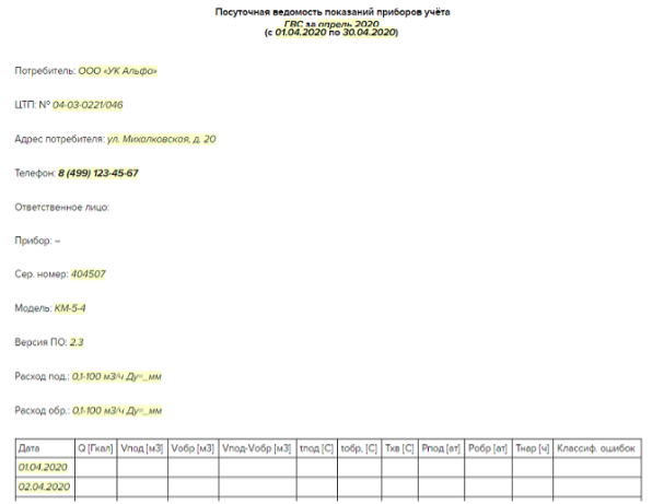Рисунок 4. Пример посуточной ведомости по ГВС