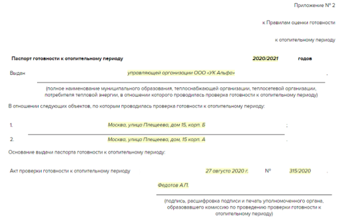 Рисунок 6. Пример заполненного паспорта готовности к отопительному периоду