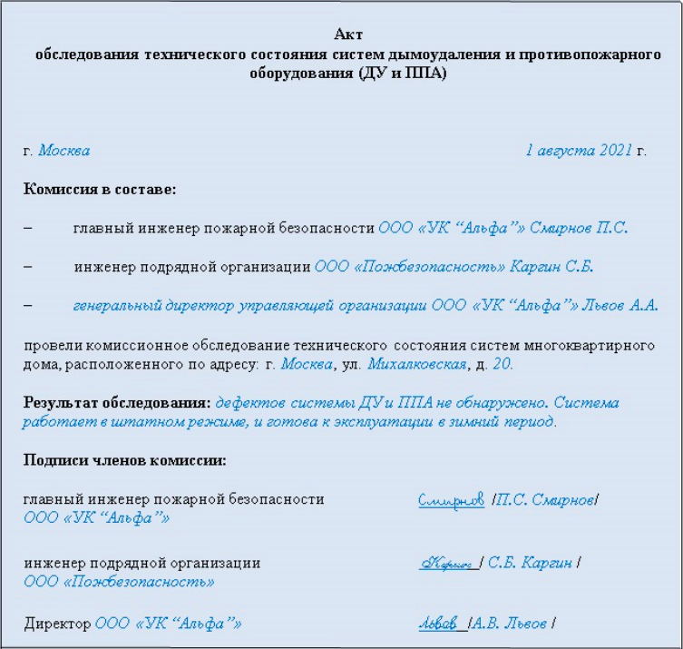 Когда составить акт. Акты составляйте сразу по итогам обследования. Летний осмотр проведите не позже августа, чтобы у вас было время зафиксировать его результаты в акте. Дело в том, что точных сроков закон не устанавливает, указаны лишь периоды — зима и лето. Точные сроки и периодичность осмотров могут установить собственники помещений, например, в договоре управления МКД.