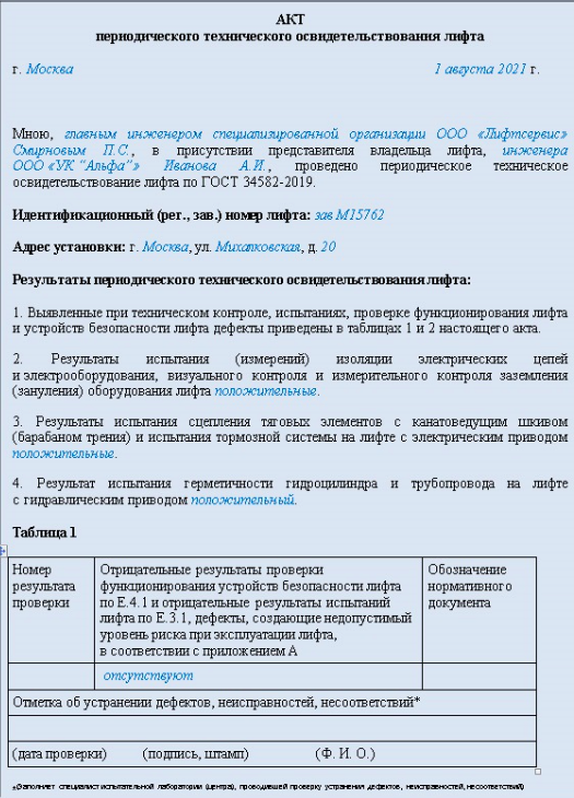 Когда составить акт. Акт составляют по итогам проверки, которую проводят один раз в год. Документ подписывает представитель управленца и лифтовой организации. Оригинал акта передают управляющей МКД организации как представителю владельца лифта.