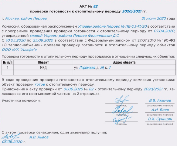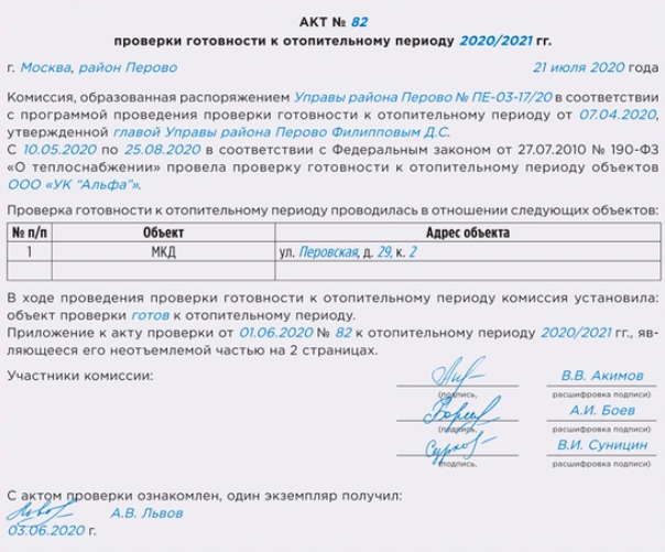 Когда составить акт. В течение дня после проверки дома к отопительному периоду комиссия заполнит акт. В него вписывают результаты проверки и заключения.