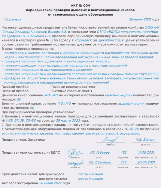 Проверять работу вентиляционных каналов нужно два раза в год в домах, где есть газовые приборы, и один раз — где такие приборы отсутствуют. Проверку проводят путем осмотра, результаты фиксируют в акте. Такие рекомендации предусматривает пункт 5.5.12 Правил и норм технической эксплуатации жилищного фонда, утвержденных постановлением Госстроя России от 27.09.2003 № 170.