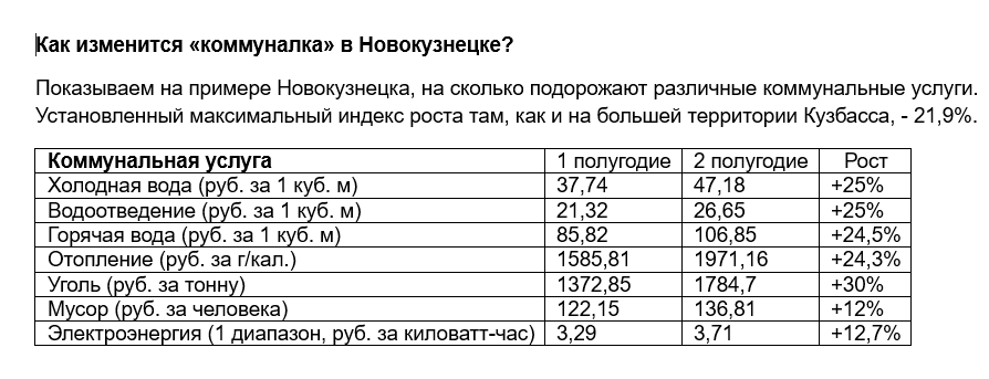 Напомним, правительство РФ утвердило такие максимальные индексы для Кузбасса: 19,8%, с максимальным отклонением 2,1%. Т. е. подразумевалось, что в некоторых случаях «коммуналка» подорожает на 21,9%.