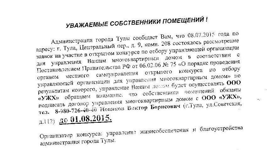 Жители домов № 4 и 8 по ул. М. Жукова, 58, по ул. Полюсная, 79 и по ул. Кабакова, 98 по Одоевскому шоссе в июне провели собрание, собрали подписи, подписали протокол и с чувством выполненного долга успокоились. Но вот вместо таблички новой УК на дверях их подъездов появилась вот такая писулька.