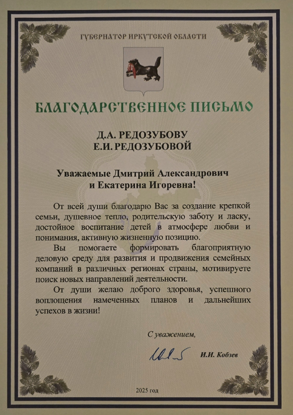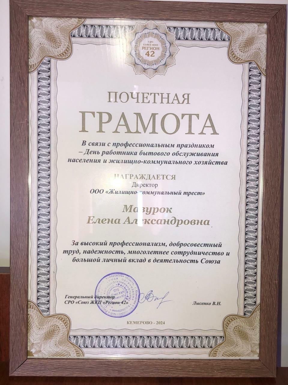 Министр жилищно-коммунального и дорожного комплекса Кузбасса вручил Редозубову Дмитрию Александровичу почётную грамоту за значительный вклад в развитие жилищно-коммунального хозяйства, высокие профессиональные достижения и в связи с победой в номинации «Лучшая практика в работе с жильцами» Всероссийского Конкурса «Лидеры ЖКХ 2024».