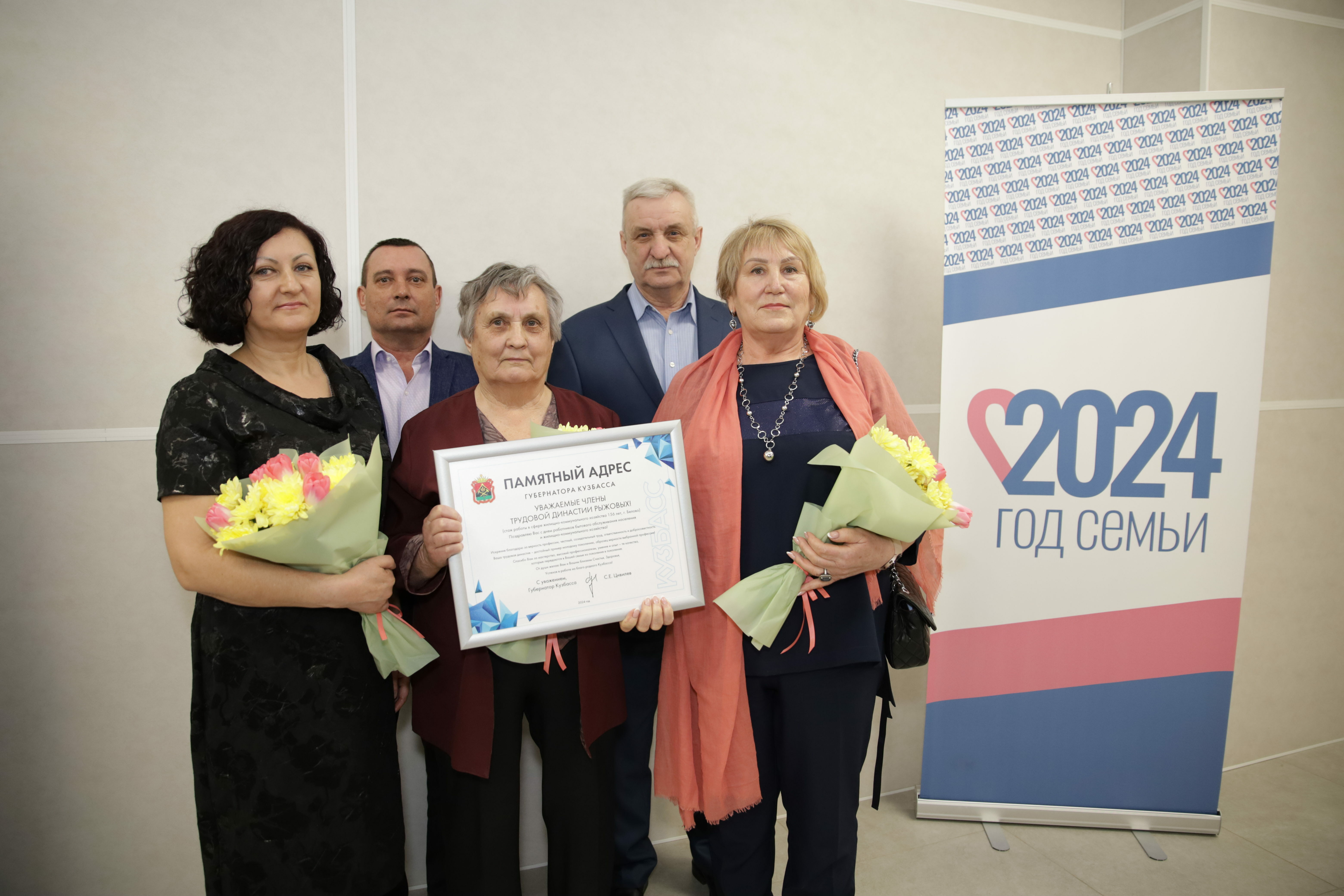 В рамках Года семьи, объявленного Президентом России Владимиром Путиным, на прием приглашена семья Рыжовых из Белова. Суммарно они трудятся в сфере ЖКХ 156 лет. За сохранение преемственности поколений в профессии, верность семейным традициям и большой личный вклад в развитие жилищно-коммунальной отрасли города трудовая династия Рыжовых отмечена памятным адресом губернатора.