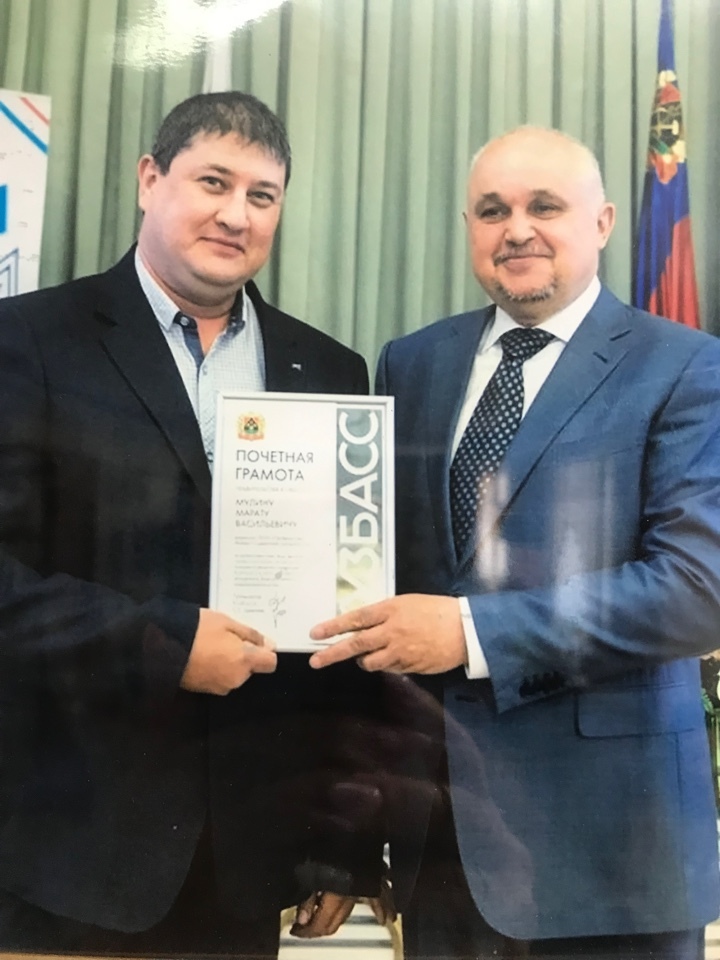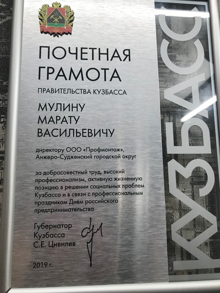 Почетной грамотой Правительства Кузбасса за добросовестный труд, высокий профессионализм и активную жизненную позицию был награжден Мулин Марат Васильевич, Директор ООО «Профмонтаж», город Анжеро-Судженск.