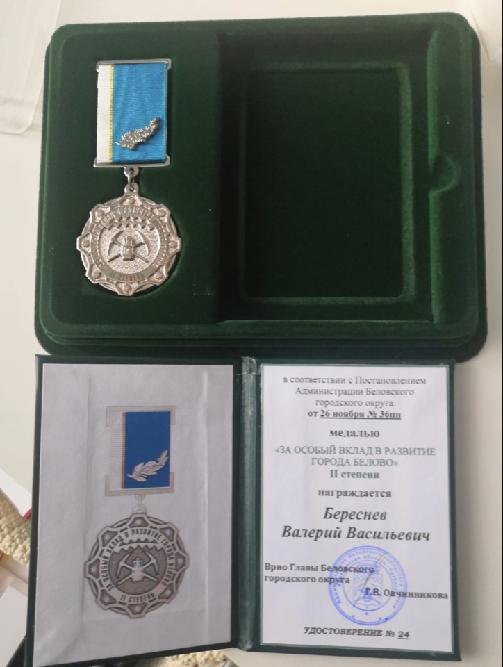 медалью «ЗА ОСОБЫЙ ВКЛАД В РАЗВИТИЕ ГОРОДА БЕЛОВО» II степени — Береснев Валерий Васильевич руководитель управляющей компании ЗОДЧИЙ